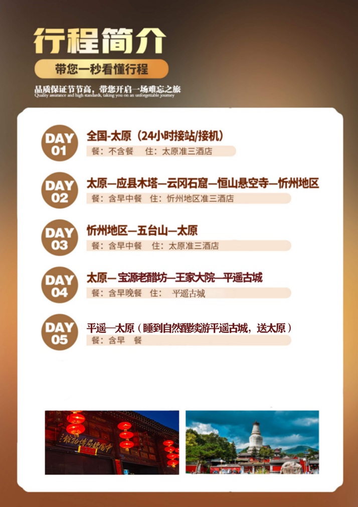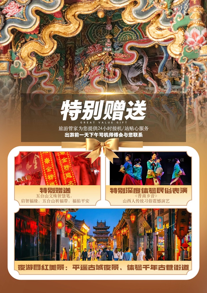 行程以“千年晋韵,非遗匠心”为主线,行程特别融入五台山非遗民俗工坊-【紫府记忆特产超市或福缘阁】(参观时间60分钟)